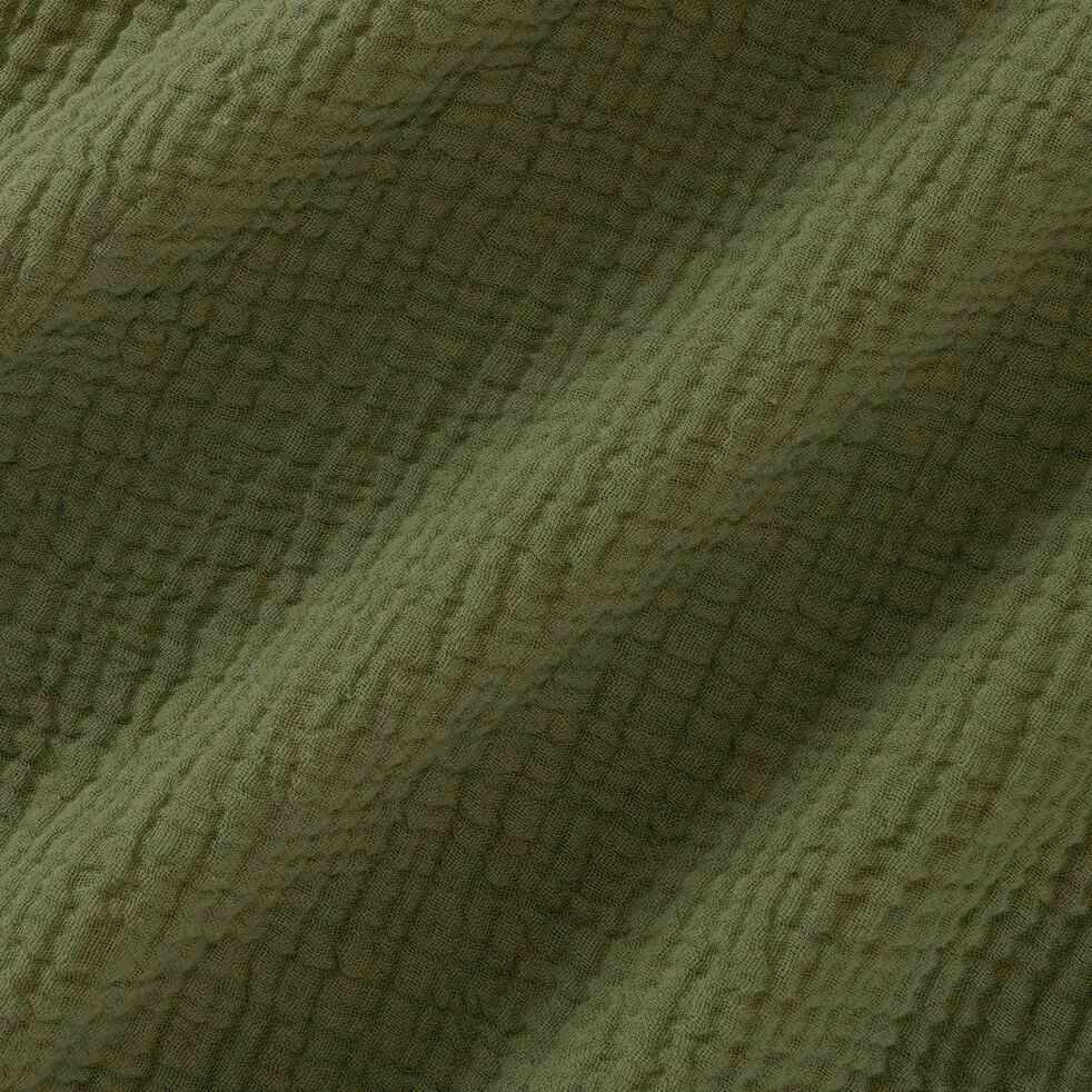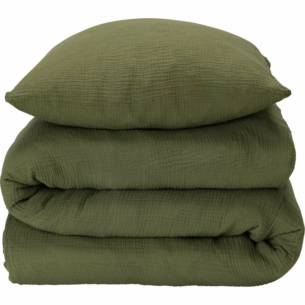 Aménagez une chambre chaleureuse et agréable à vivre avec la parure de lit Baleti. Confectionnée en double gaze de coton, cette parure verte arbore une texture froissée, à la fois charmante et très pratique d’entretien. La double gaze vient apporter une touche de confort sans pareil à votre lit, tissu doux et réconfortant que l’on ne se lasse pas de toucher. Cette parure unie se compose d’une grande housse de couette de 260×240 cm. Celle-ci s’accompagne de deux taies d’oreiller assorties de 63×63 cm. Un ensemble élégant, à la fois chic et bohème, qui apporte à la chambre charme et caractère.