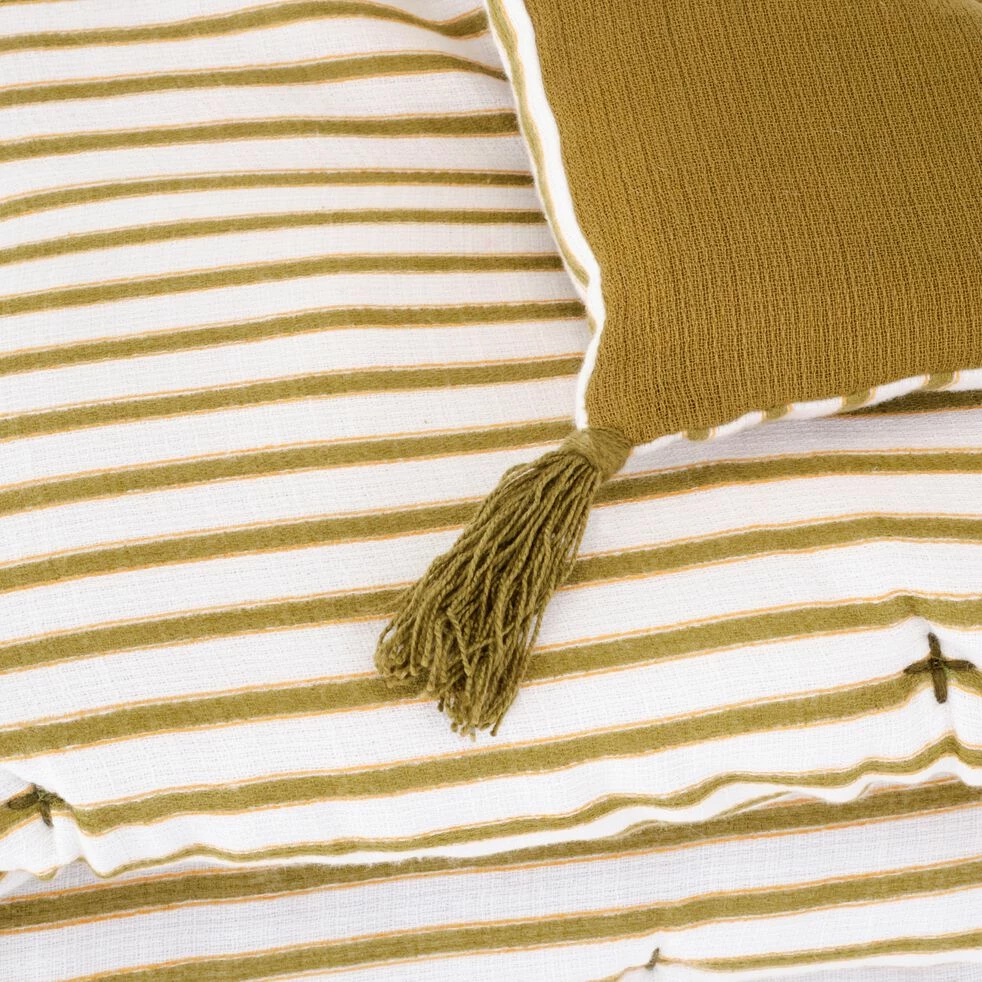 Entre terre et mer, l’édredon Bolero s’inspire des codes des deux univers pour offrir un motif hétéroclite. Cet édredon réversible présente deux faces. D’un côté, le tissu en double gaze de coton arbore des rayures, motif élégant et intemporel. De l’autre, la toile en coton est unie, dans un coloris vert. En quelques secondes, cet édredon matelassé change de style et de caractère. Avec sa finitions pompons, c’est un objet déco fantaisiste qui s’impose comme pièce maîtresse dans la chambre à coucher.