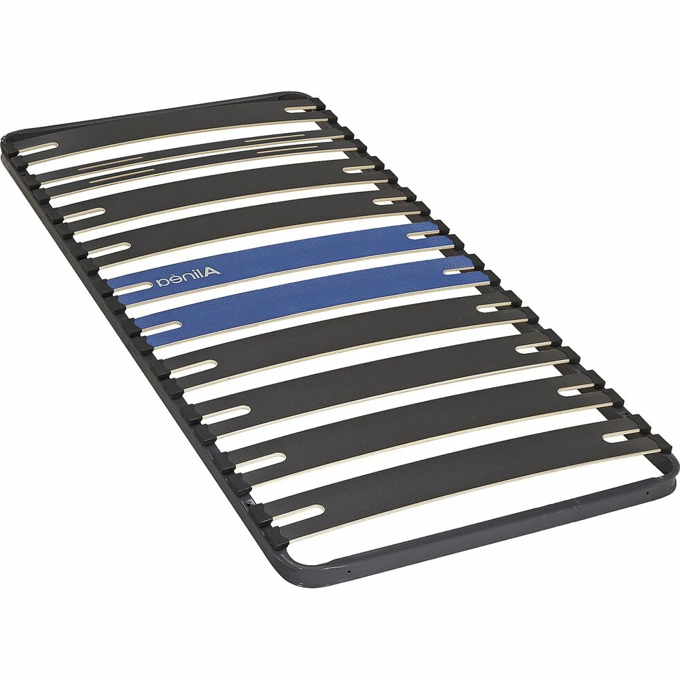 Cadre Calea 313 140×200 2×11 lattes multi-plis, multi -essences ( bouleau ou Eucalyptus ou peuplier) dont 9 lattes larges et 2 lattes creux d’épaule. Cadre métal cintré en tube rectangulaire 40×27. Epoxy gris. Lattes anti-glisse. 4 Lattes bleues dont une signée Alinéa. Double axe central de renfort pour double couchage. Lattes large de 125mm ép 8mm 2 lattes spéciales creux d’épaules largeur 50mm ép 8mm. Embouts polyéthylène clipsés. 2 Pieds centraux de liaison fournis pour le 2x80x200 déjà monté hors livraison