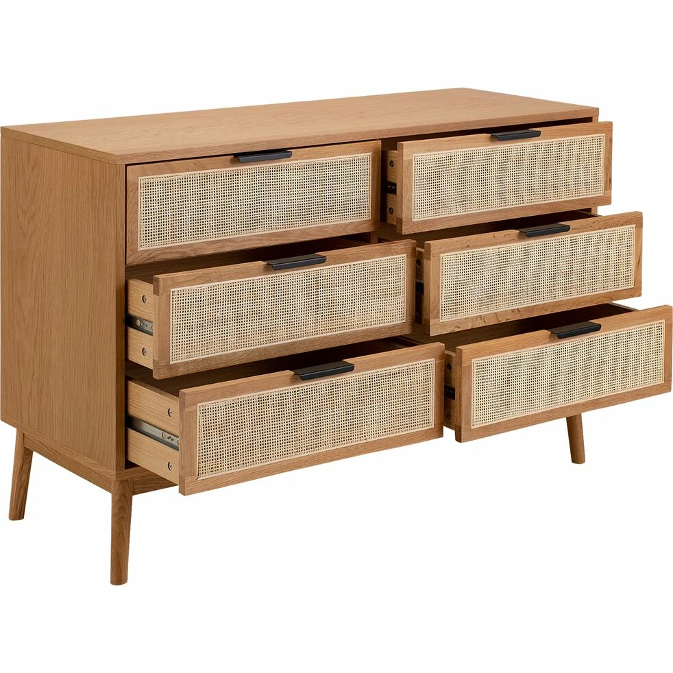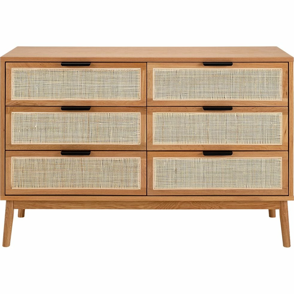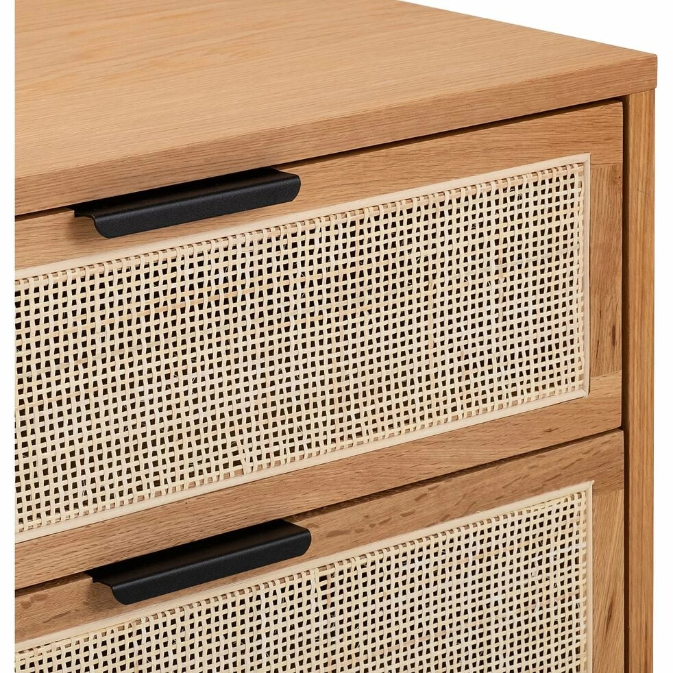 Chêne et MDF chêne plaqué, façade des tiroirs en canne naturelle.