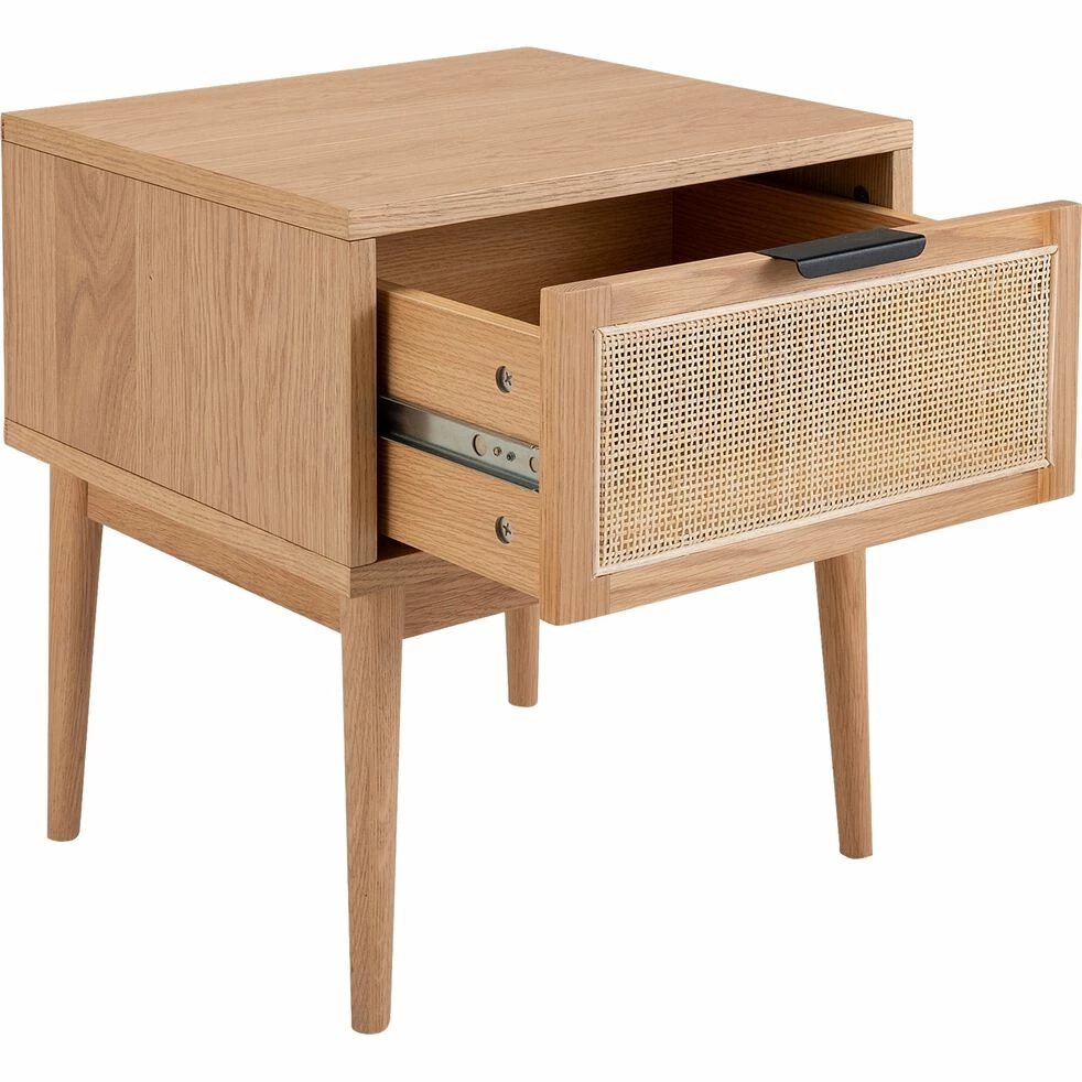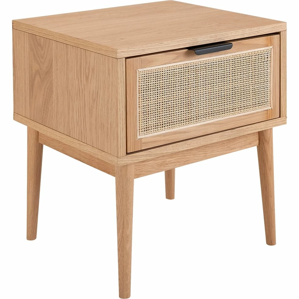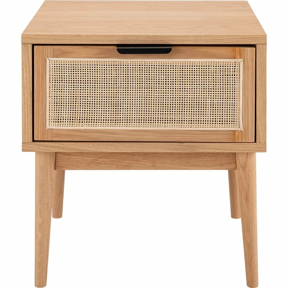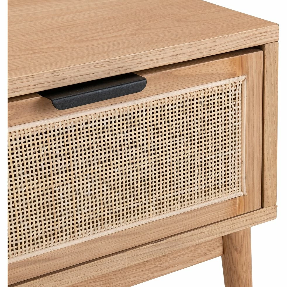 Réchauffez la décoration de la chambre avec cette table de chevet en bois et cannage. La structure en chêne massif arbore un coloris clair, orné de fines veinures. Brut et authentique, ce cadre s’accompagne d’une finition en cannage et d’une poignée noire. Simple mais design, cette table de nuit peut accueillir votre lampe de chevet, un livre, une plante, des cosmétiques… Dans son tiroir coulissant, rangez quelques affaires et profitez d’un intérieur propre et ordonné.