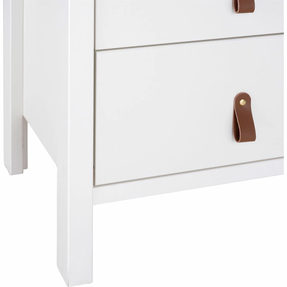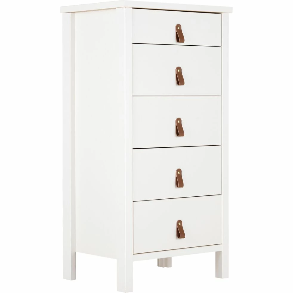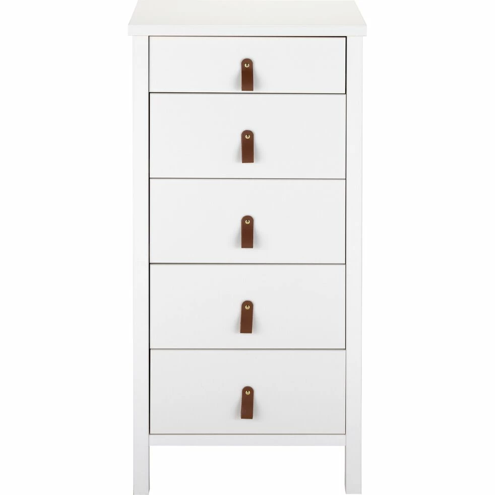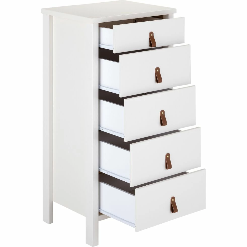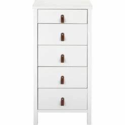Ce chiffonnier en bois est un meuble au design et aux coloris intemporels. Ce chiffonnier blanc se compose de 5 tiroirs, ce qui offre une grande capacité de rangement. Des lanières apparaissent en guise de poignées, ce qui offre à ce meuble un style un peu vintage. Ce mobilier de chambre est un bel élément déco pour votre intérieur. Ce joli chiffonnier se décline en 3 coloris.Laissez-vous aussi séduire par les autres éléments de la collection.