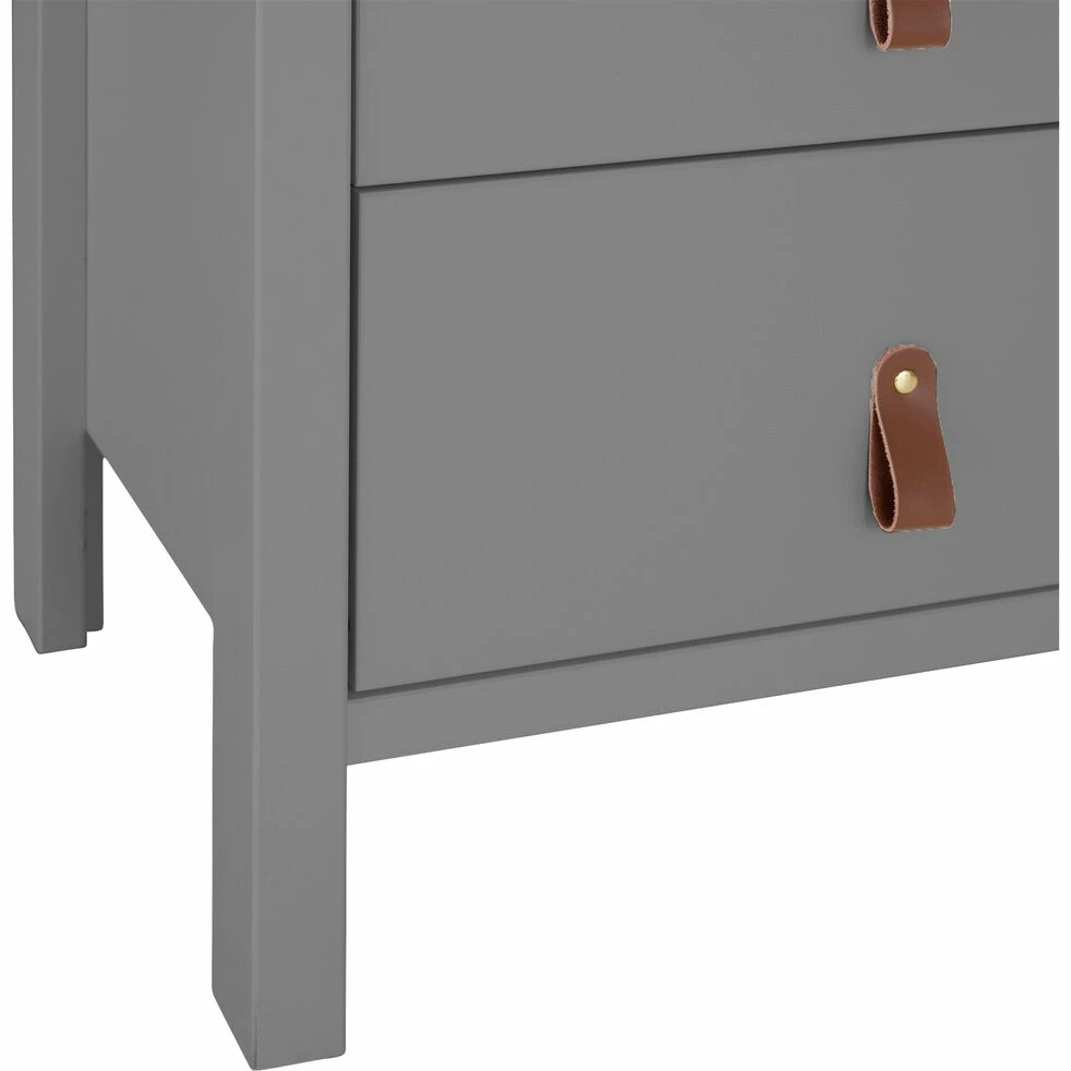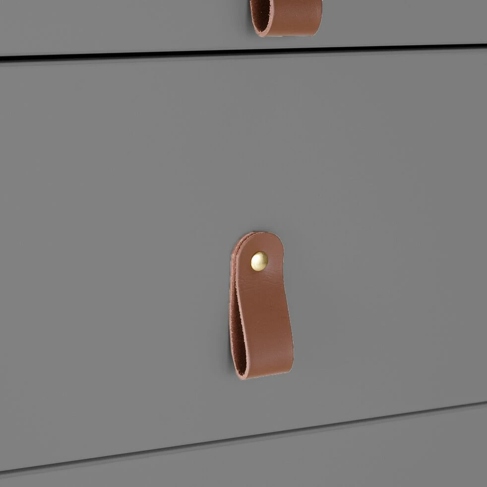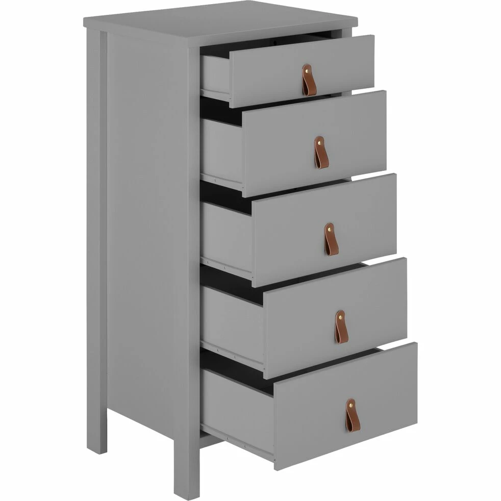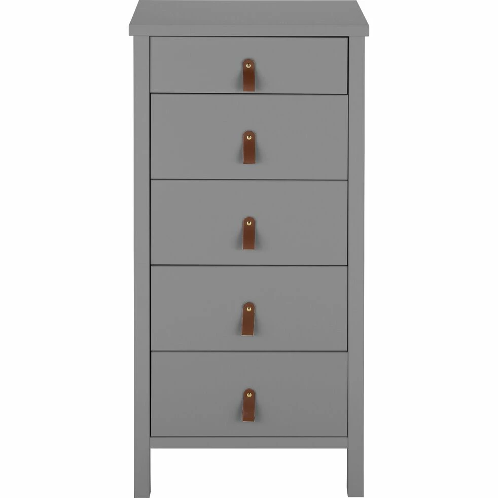 Ce chiffonnier en bois est un meuble au design et aux coloris intemporels. Ce chiffonnier gris se compose de 5 tiroirs, ce qui offre une grande capacité de rangement. Des lanières apparaissent en guise de poignées, ce qui offre à ce meuble un style un peu vintage. Ce mobilier de chambre est un bel élément déco pour votre intérieur. Ce joli chiffonnier se décline en 3 coloris.Laissez-vous aussi séduire par les autres éléments de la collection.