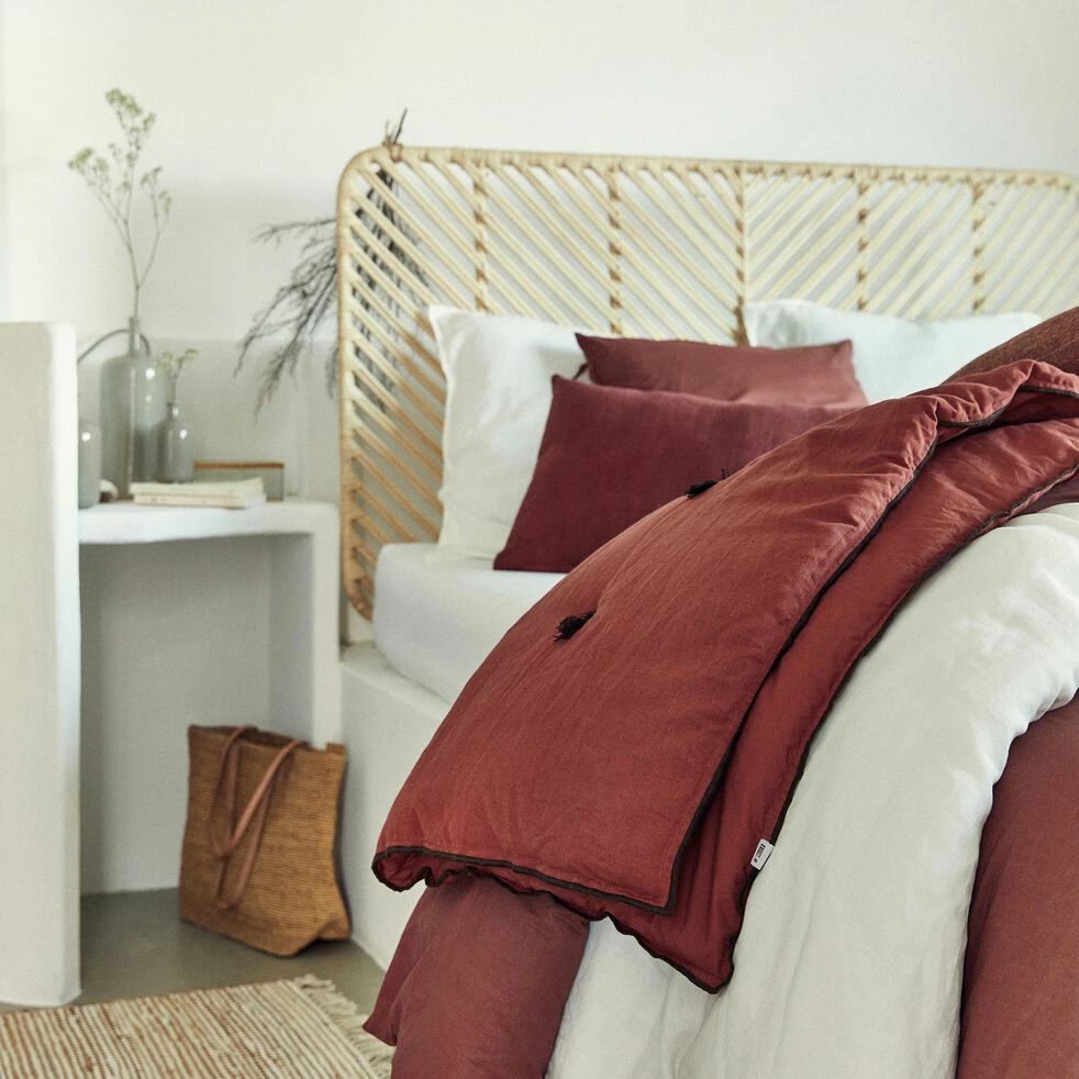 L’édredon est un linge de lit utilisé pour apporter moelleux et chaleur aux dormeurs. De 100×180 cm, il se place sur le plateau du lit, sans dépasser. Aujourd’hui, l’édredon est un élément de décoration à part entière de la chambre à coucher. Cet édredon rouge argile réchauffe la décoration et épouse parfaitement une décoration berbère. Matelassé, il garde sa fonction première : conserver la chaleur. Cet édredon en lin et coton apporte également une touche de douceur grâce à son toucher naturel et soyeux. Les ponpoms et la finition passepoil achèvent ce linge chaleureux, allié d’une décoration cosy et d’un sommeil réparateur.