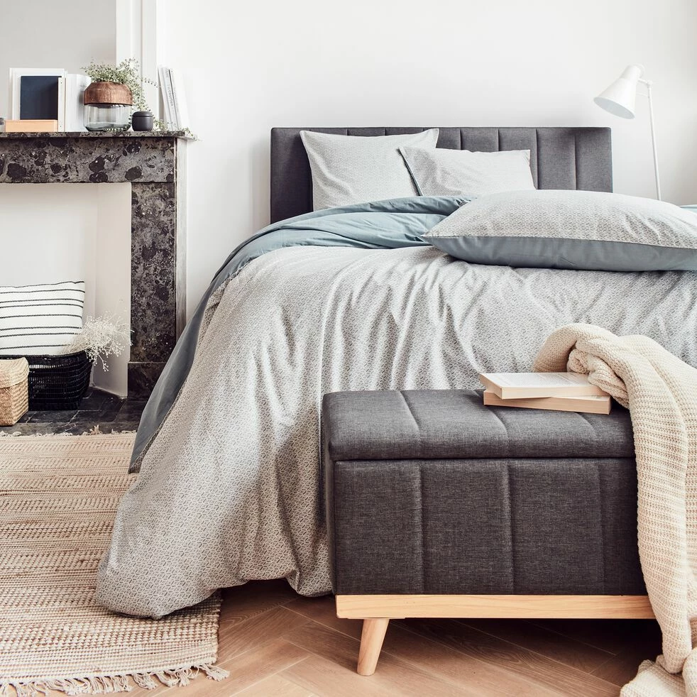 Cette housse de couette en 240×220 cm en coton 57 fils/cm2 est réversible. D’un côté, elle présente un aplat bleu uni pour une décoration simple et intemporelle. De l’autre, un motif marocain est mis à l’honneur. De petites arabesques dansent sur le tissu. Ce motif fantaisie est inspiré de l’architecture marocaine. On le retrouve sur les portes et fenêtres de certains palais, mosquées et riads. Un clin d’oeil ethnique insufflant un vent chaleureux dans la pièce. Cette housse de couette 2 personnes est entièrement confectionnée en coton, un matériau doux, résistant et respirant.