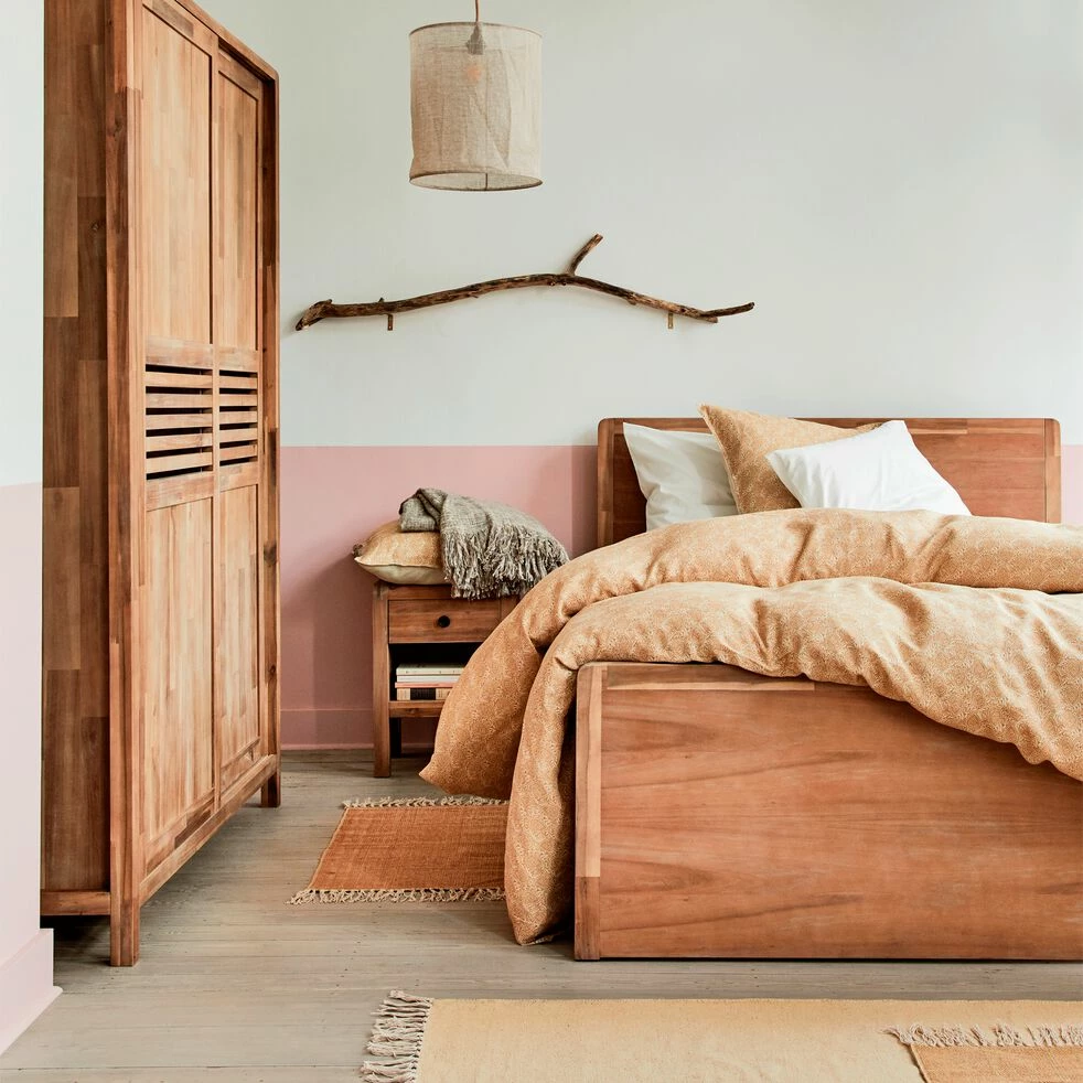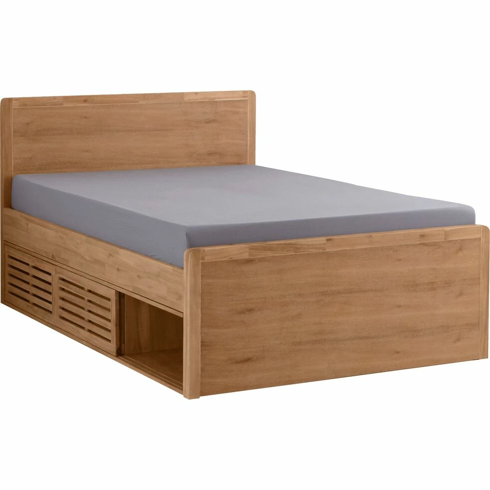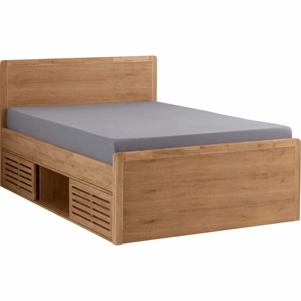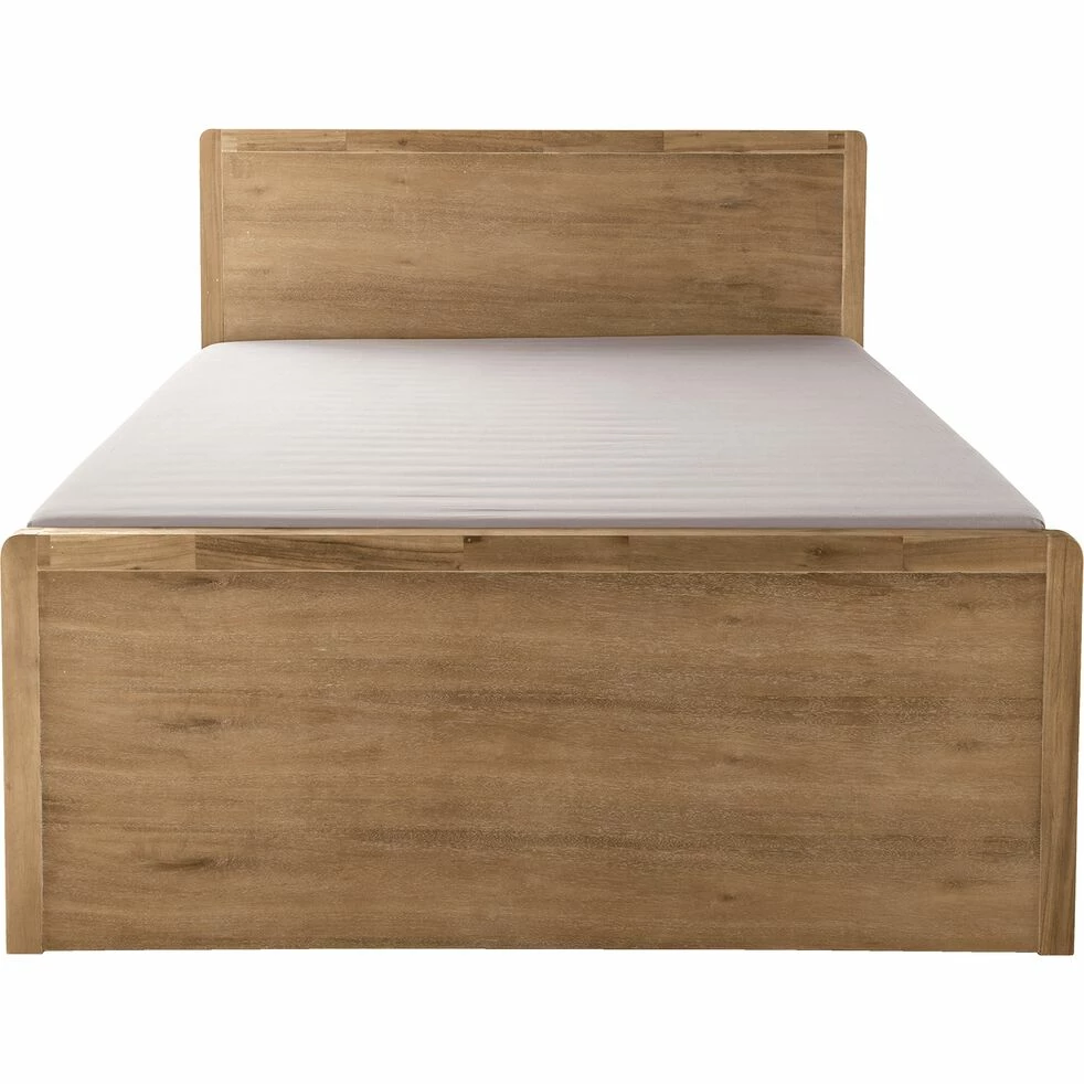 Tête et pied de lit en panneaux de fibres de moyenne densité, placage acacia. Les autres parties sont en acacia massif. Finition nitro-cellulosique