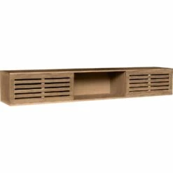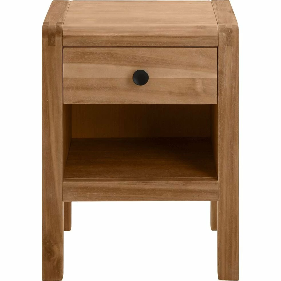 Façade du tiroir, dessus, fond côtés en acacia massif. Dessus, étagère et panneaux des côtes en panneaux de fibres de moyenne densité. Placage acacia. Poignée noire en métal acier époxy. Finition nitro-cellulosique.
