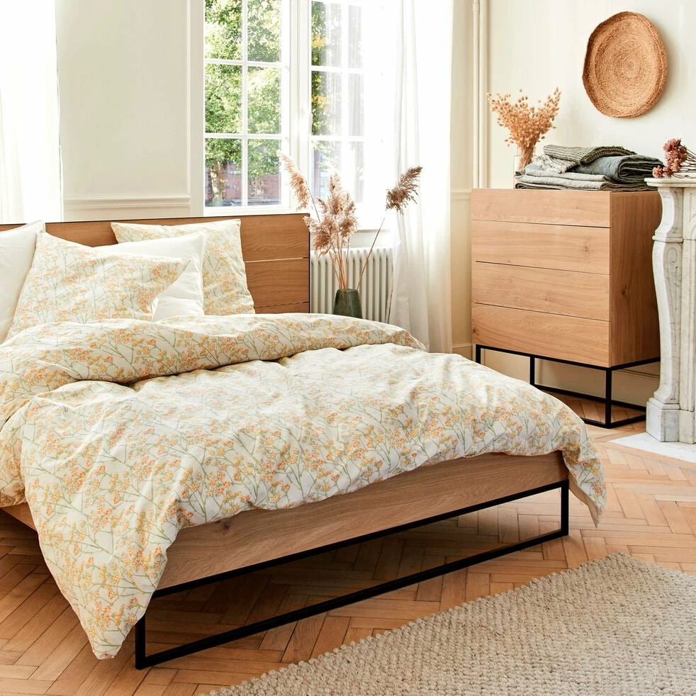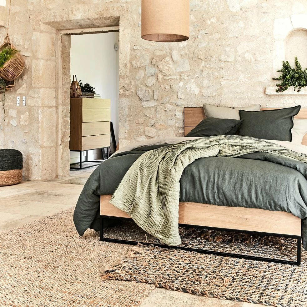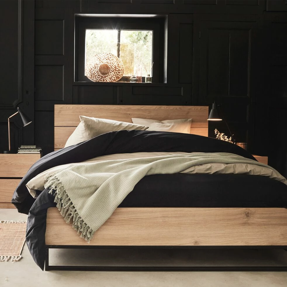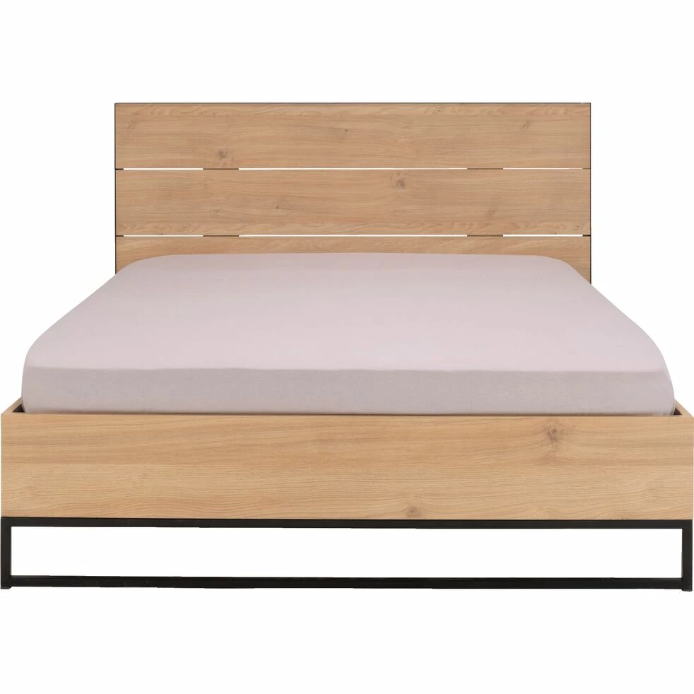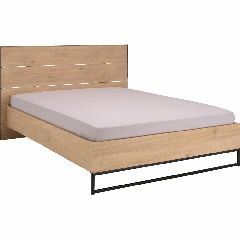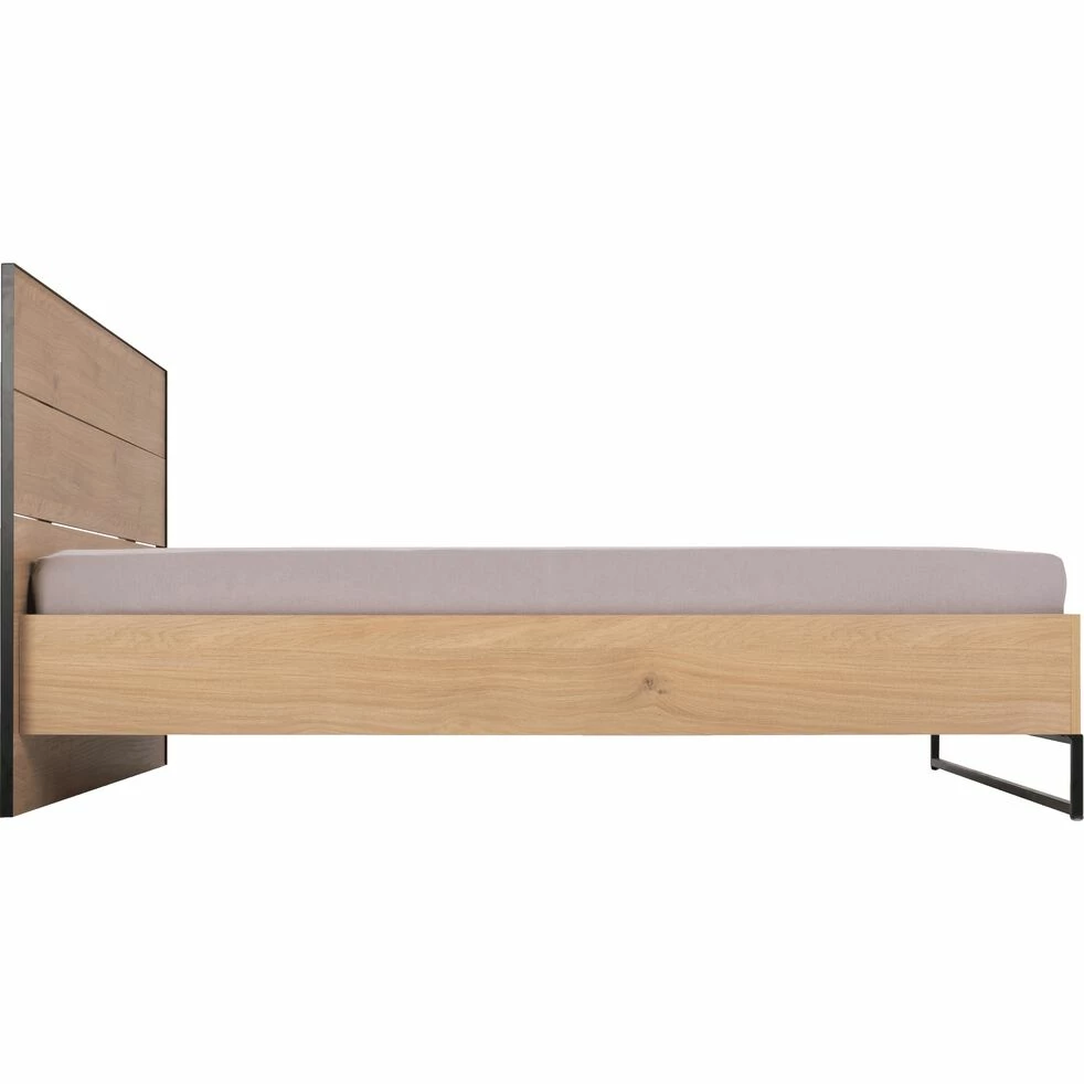 Le lit Gaspard en 160x200cm est à la fois minimaliste et a un style affirmé. L’association du métal noir et d’un effet bois clair offre un contraste entre un matériau dur et froid et un autre plutôt chaleureux et apaisant. C’est un équilibre parfait qui donne une note d’originalité à la chambre. Ses pieds, armature en fer rectangulaire, permettent de surélever le lit et de créer un espace aéré et léger. La tête de lit habille avec classe et donne une jolie finition avec son pourtour métallique. De plus la taille de ce dernier vous offre un bel espace de repos.