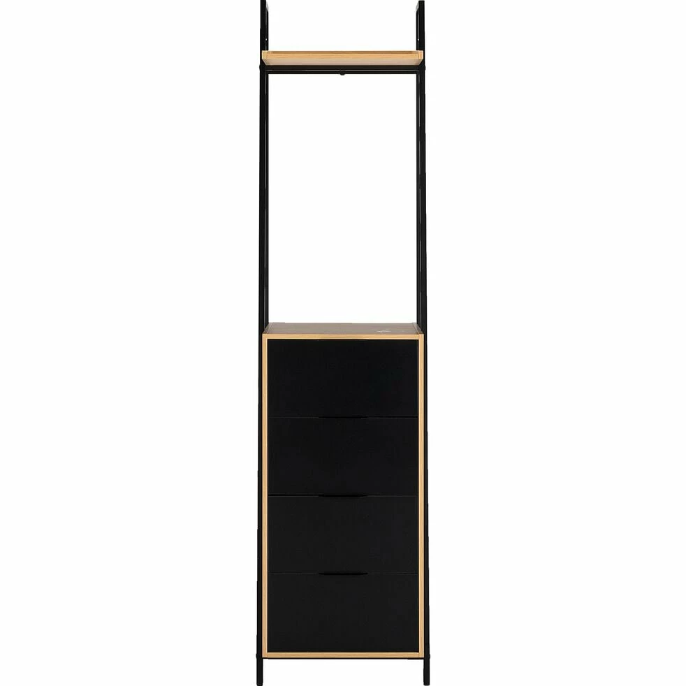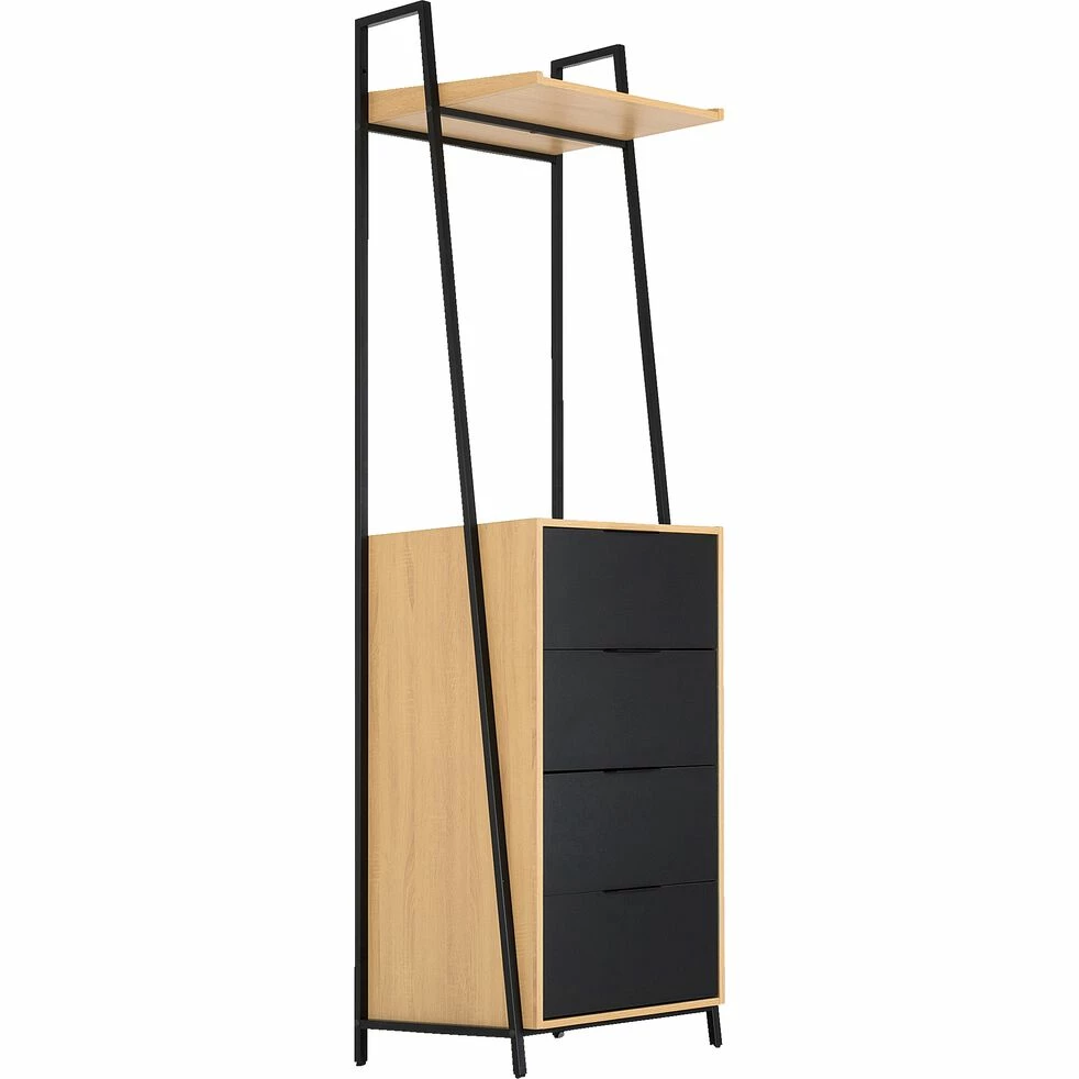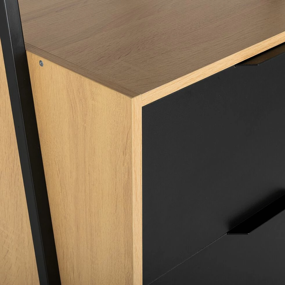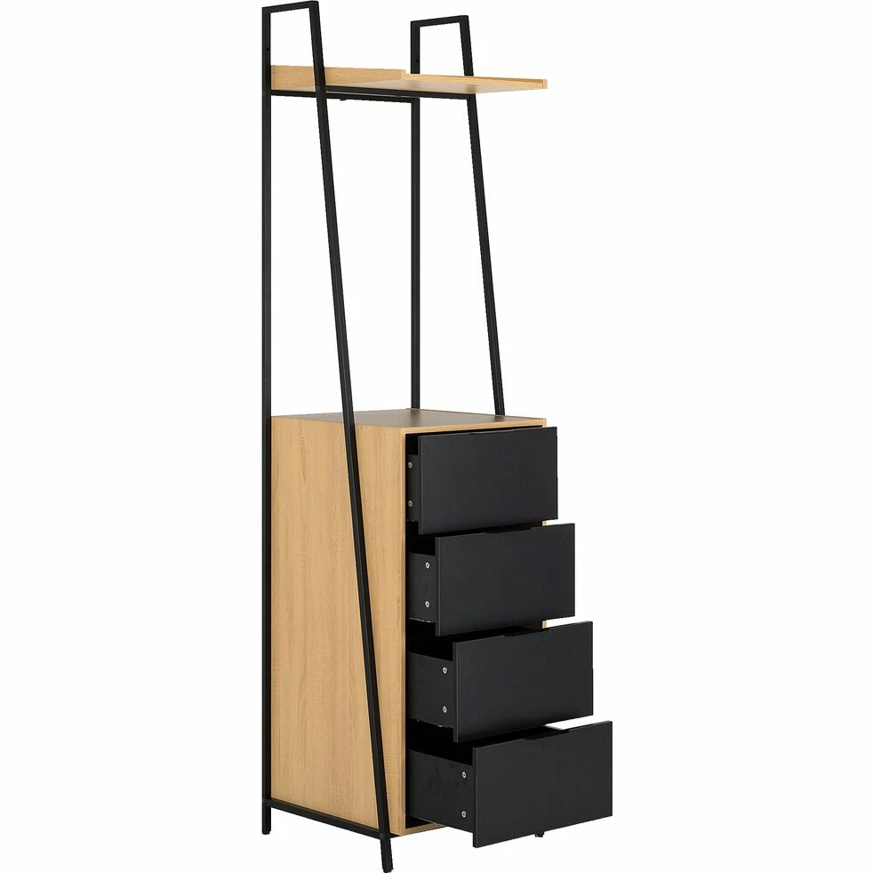 Cette commode de chambre vous offre une grande capacité de rangement avec ses quatre tiroirs coulissants. Le métal noir industriel contraste avec le bois clair chaleureux et lumineux pour donner un style moderne et tendance. Une commode design qui convient à une chambre à coucher à la décoration raffinée. Un meuble qui vous permet de ranger vos vêtements et disposer d’une tablette où poser une plante ou des cadres photos. Une commode originale, fonctionnelle et accueillante, au style distingué.