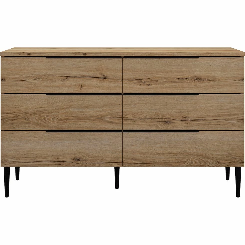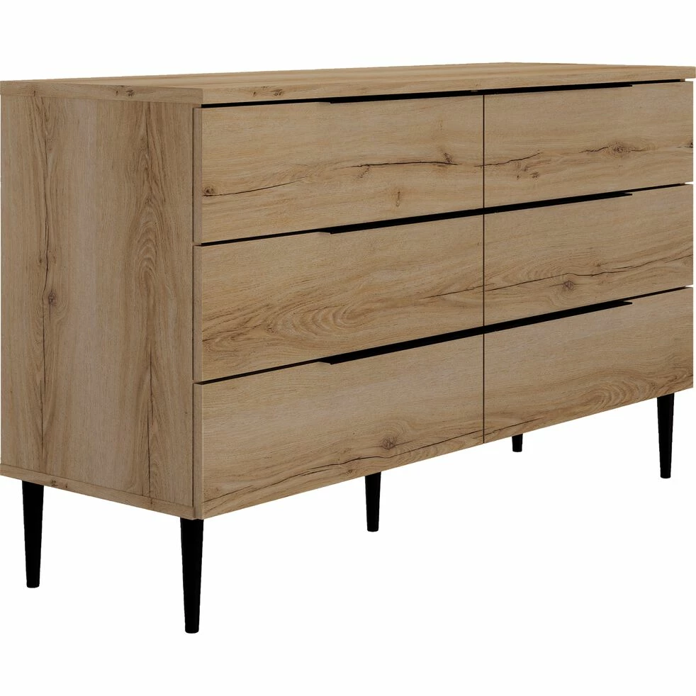 Habillez l’espace de la chambre avec charme et élégance grâce à la commode 6 tiroirs Lucian. De 130cm de long, cette grande commode apporte du cachet à la décoration. Confectionnée en bois, elle affiche de belles nervures qui offrent à la pièce un motif naturel. Cette commode en bois s’accompagne de poignées noires en aluminium, un détail moderne qui participe à un meuble élégant. Cette commode sur pieds permet de ranger vos affaires et accessoires, l’allié parfait d’une chambre ordonnée.