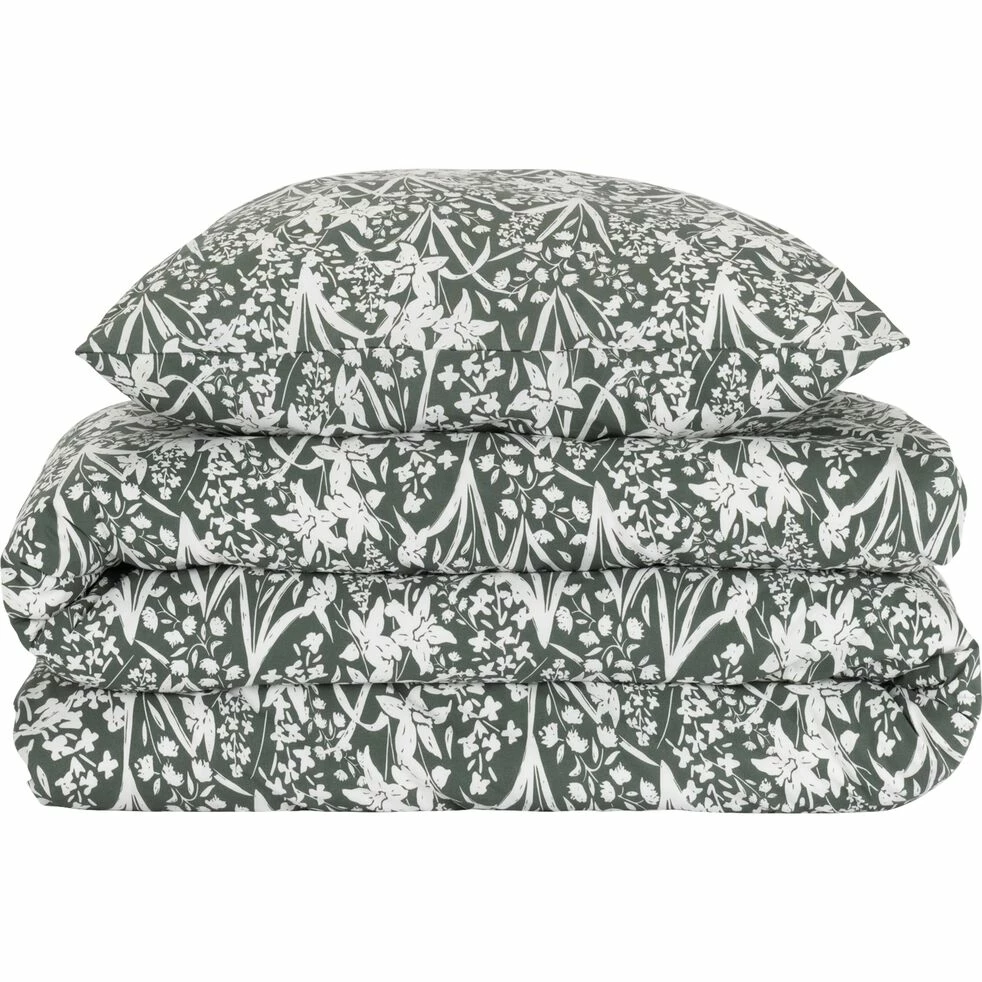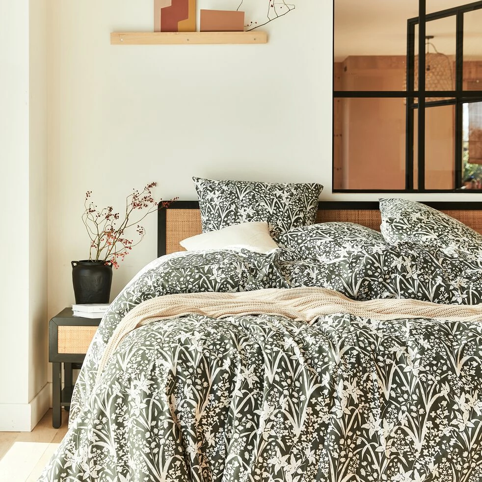 Narci est une parure de lit bicolore où vert et blanc se rencontrent à travers un motif floral. Jonquilles et arbres aux papillons viennent orner cette parure de lit en coton, linge doux et confortable dans lequel se lover à la nuit tombée. Cette parure de lit est vendue dans un totebag assorti. Ce dernier contient une housse de couette de 260×240 cm ainsi que deux taies d’oreiller de 63×63 cm. Cet ensemble trouve sa place dans la chambre tout en douceur et diffuse une esprit bohème, apaisant.