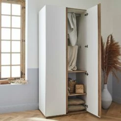 Retrouvez ici un dressing blanc avec deux portes battantes où vous pouvez ranger toutes vos affaires et vêtements. Vous pouvez acheter cette pièce seule ou associée à un des éléments de la gamme. Chaque module est indépendant, mais ils se complètent aussi parfaitement les uns avec les autres. Ce sont des produits de qualité qui vous sont proposés, avec une finition en mélanine et une impression effet bois au toucher. Résistants, ces meubles dureront dans le temps. Le montage de ces derniers est très aisé et se fait en vertical. Les coins des modules sont découpés afin de laisser passer les plinthes pour que vous puissiez placer vos meubles contre le mur. 2 tringles et 2 étagères sont comprises dans le lot.