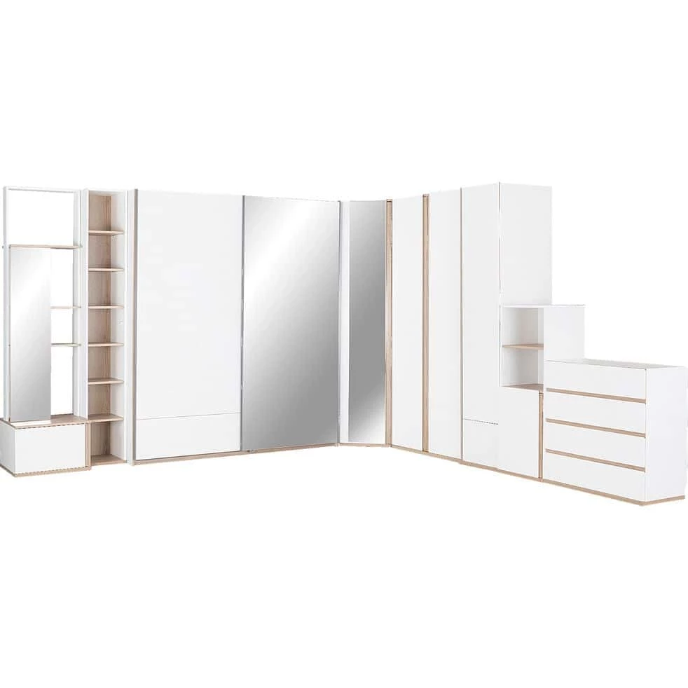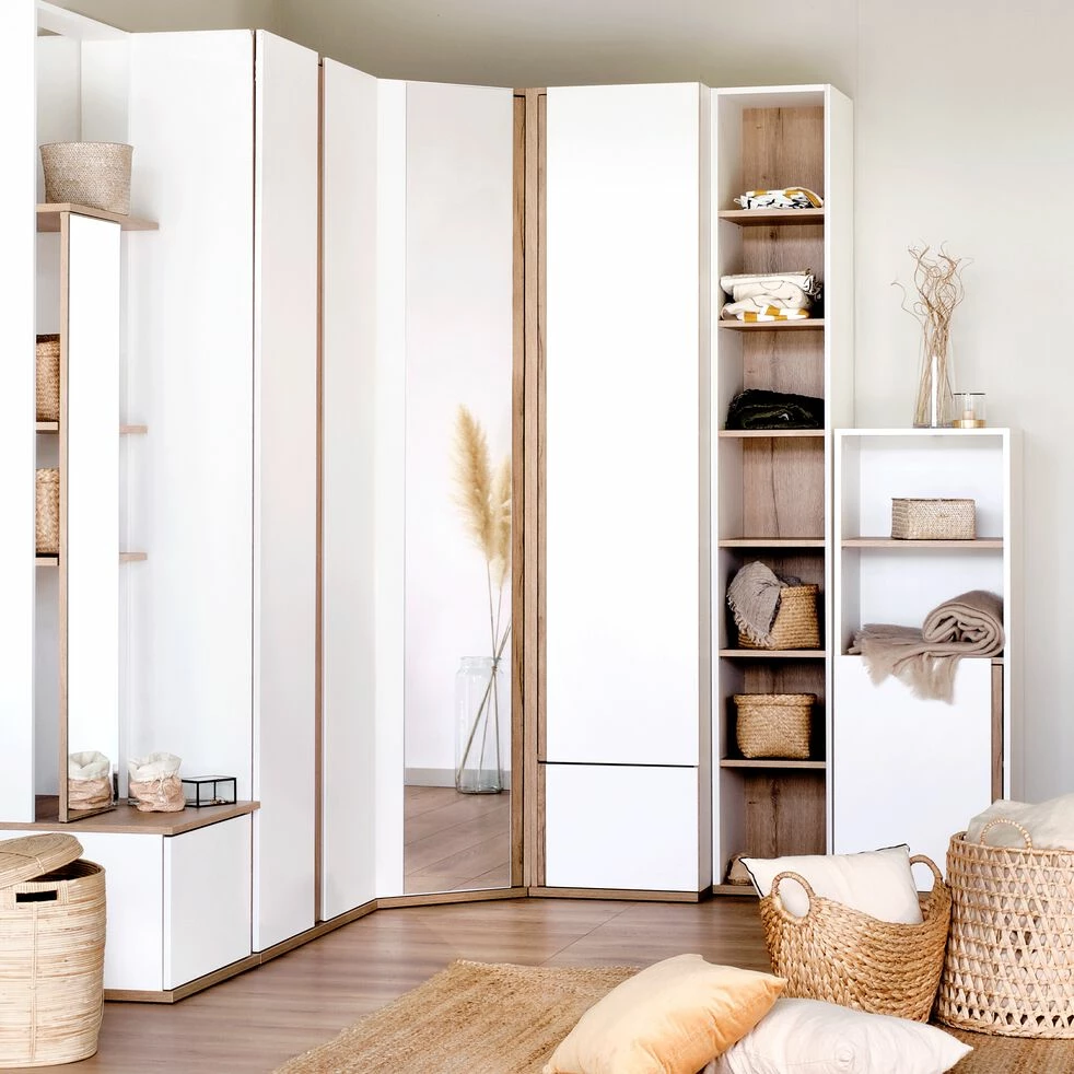 Découvrez la gamme Nestor, un enssemble coordonné de rangements modulaires qui se compose de huit à neuf éléments. Vous retrouvez donc dans cette collection : une bibliothèque, une option avec deux étagères, un dressing avec deux portes battantes, un module avec une porte et deux niches, un dressing avec deux portes coulissantes, un dressing d’angle avec une porte, un autre module avec une porte-miroir et un tiroir et enfin un module avec quatre tiroirs.