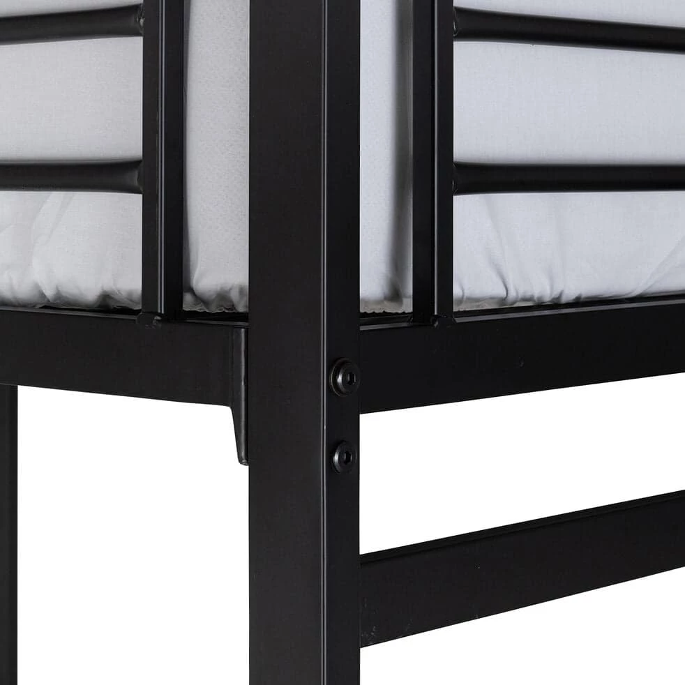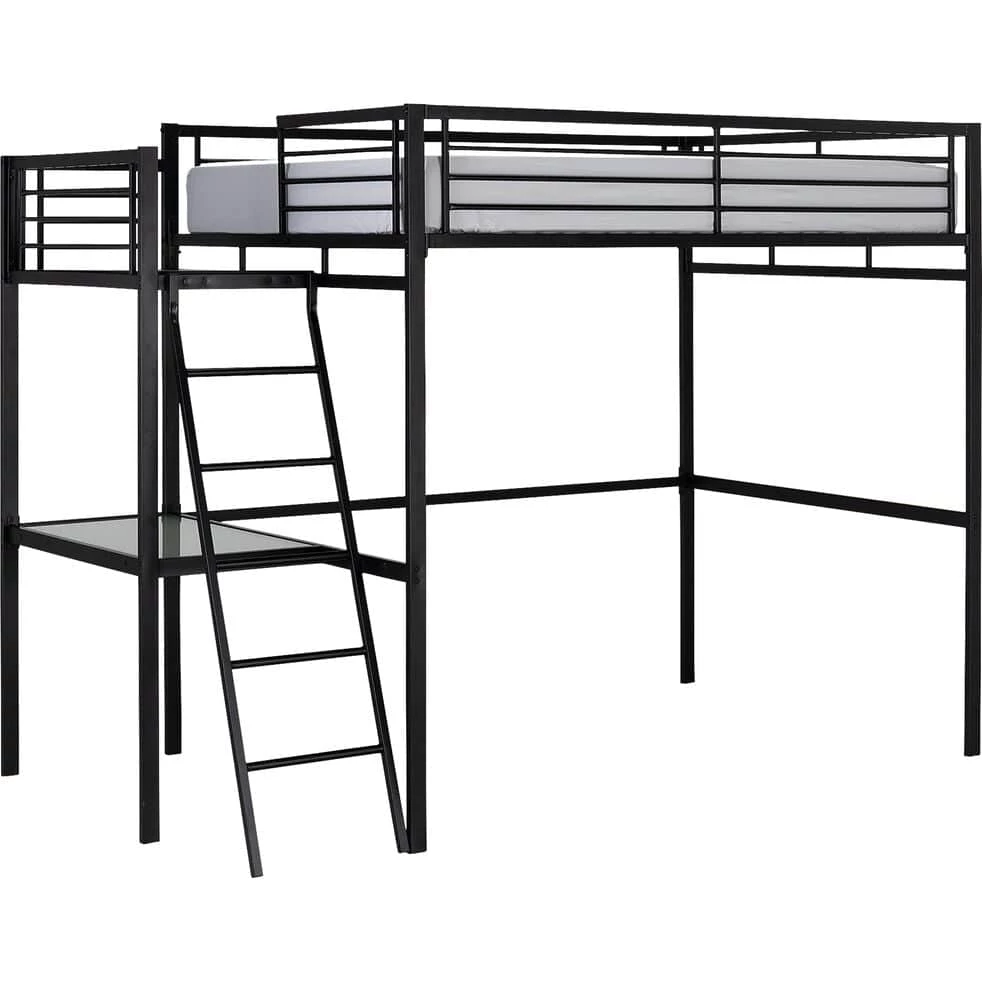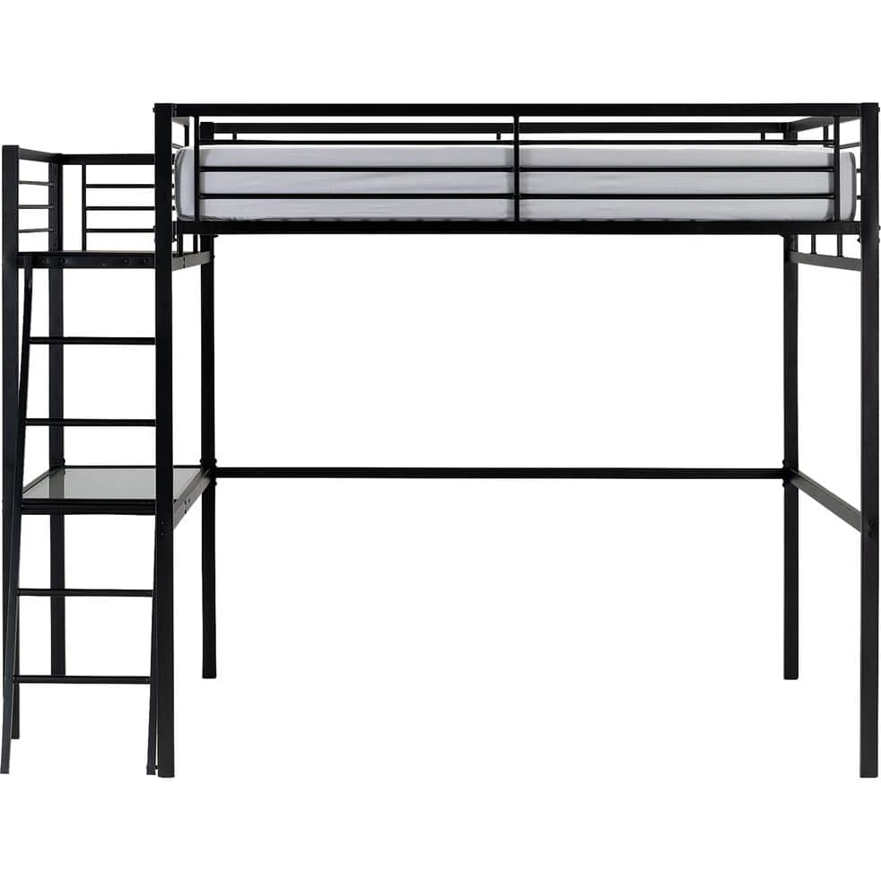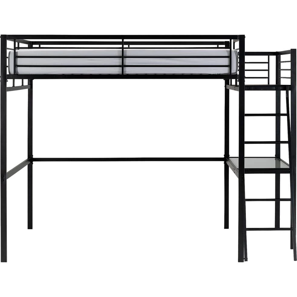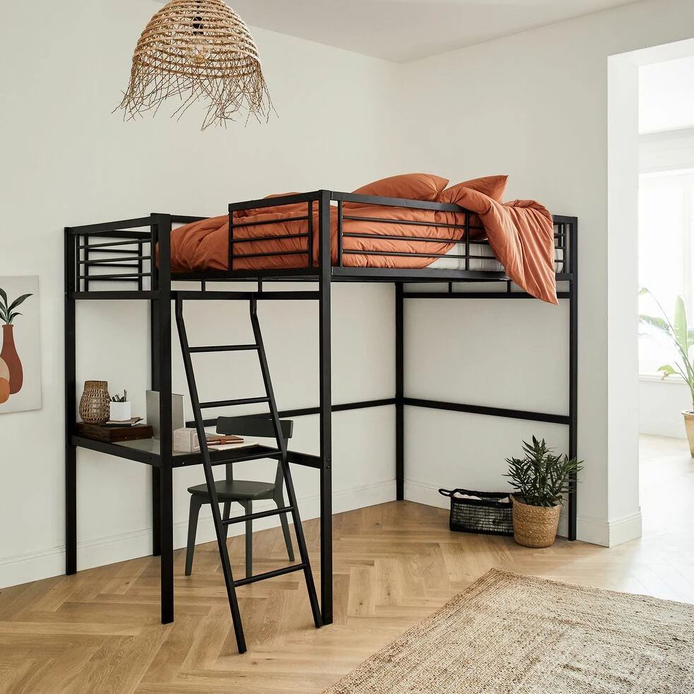 Un . Optimisé pour un gain de place maximal, il vous propose un lit en hauteur confortable pour deux personnes. Sa structure combine la robustesse de l’acier et l’élégance du noir. Doté d’une échelle inclinée et de barrières métalliques, ce lit est sécurisé et facile d’utilisation. Vous pouvez aménager un bureau de travail dessous. Son plateau en verre vous offre un bel espace studieux. Ajoutez un pouf ou un petit canapé pour créer un cocon des plus accueillants. Votre chambre devient une véritable pièce à vivre où détente et travail s’équilibrent à merveille.