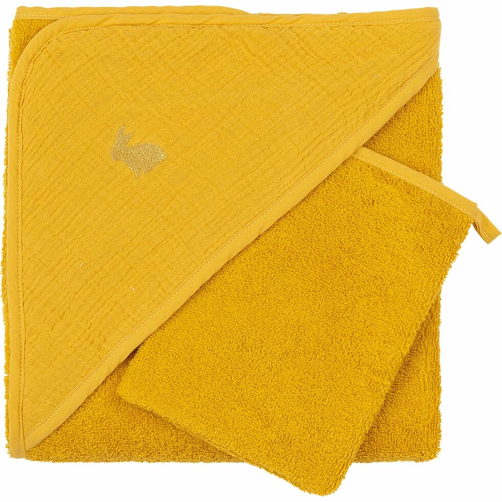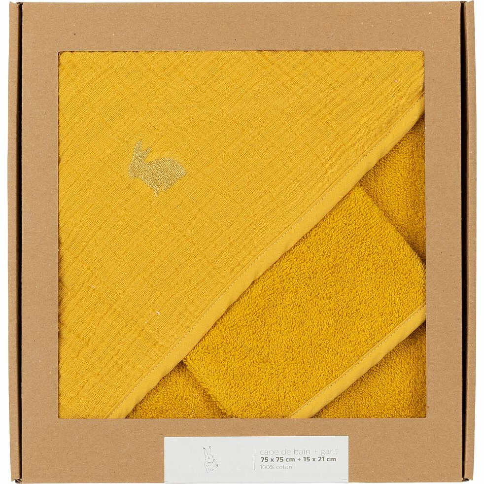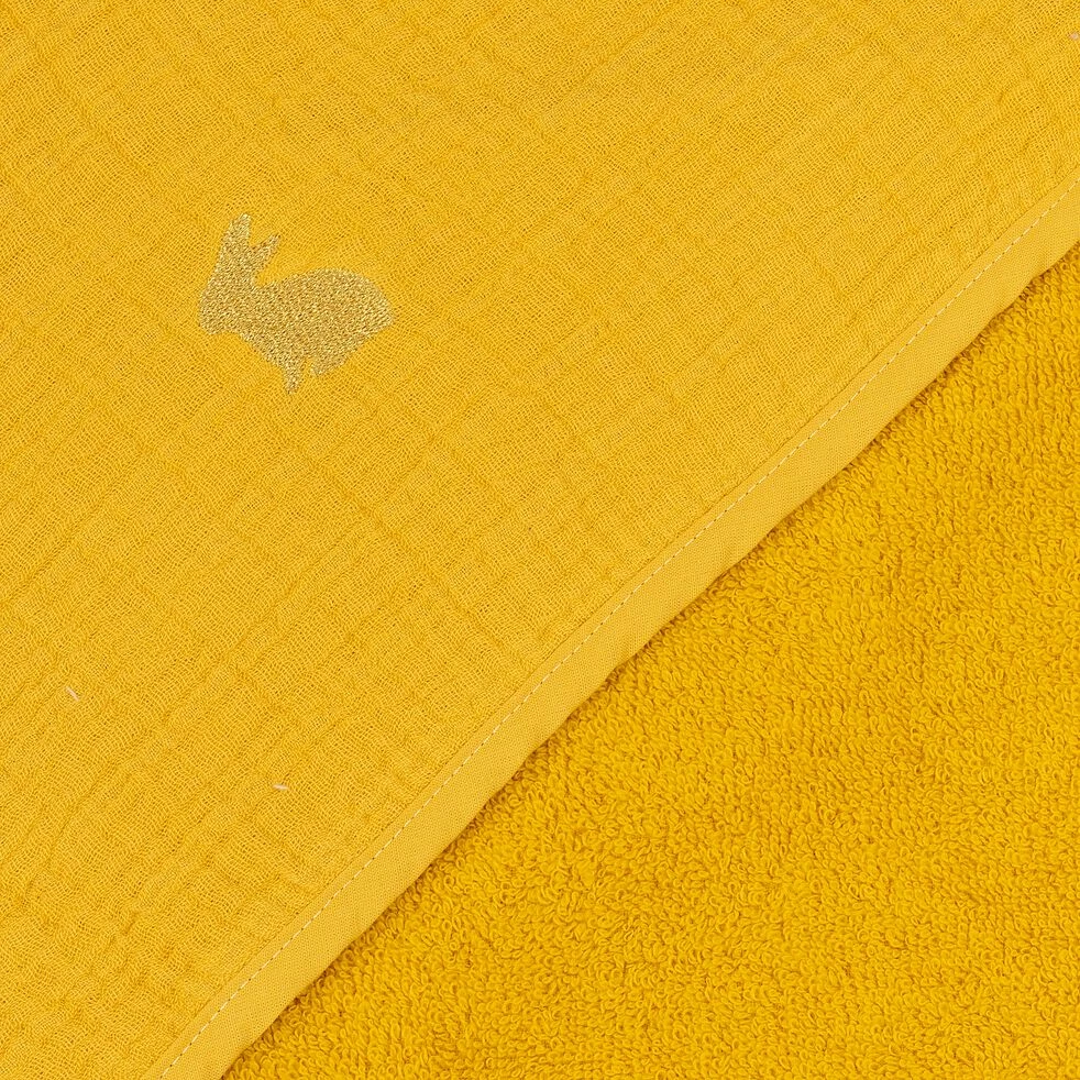 Couleur éponge + capuche et biais de coton jaune avec broderie lapin gm en lurex doré sur la capuche. -