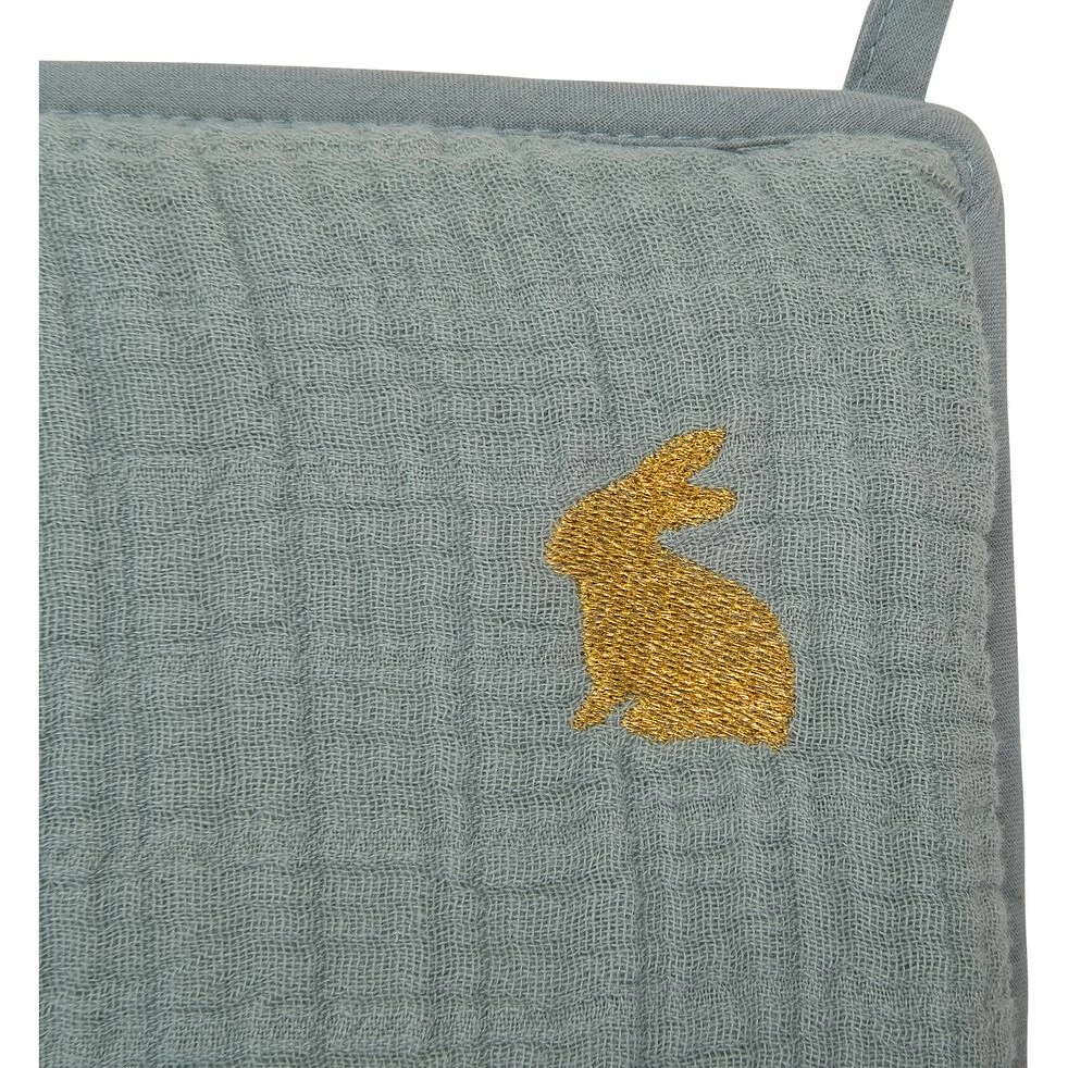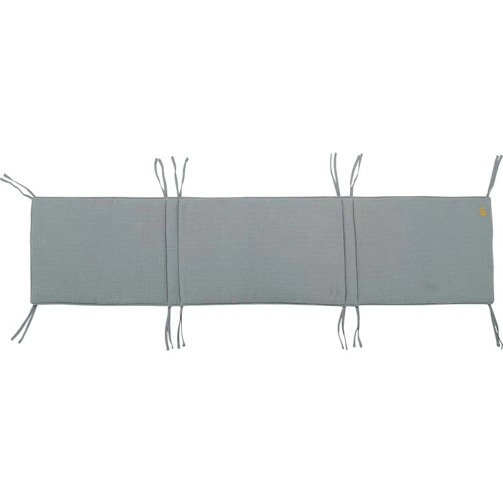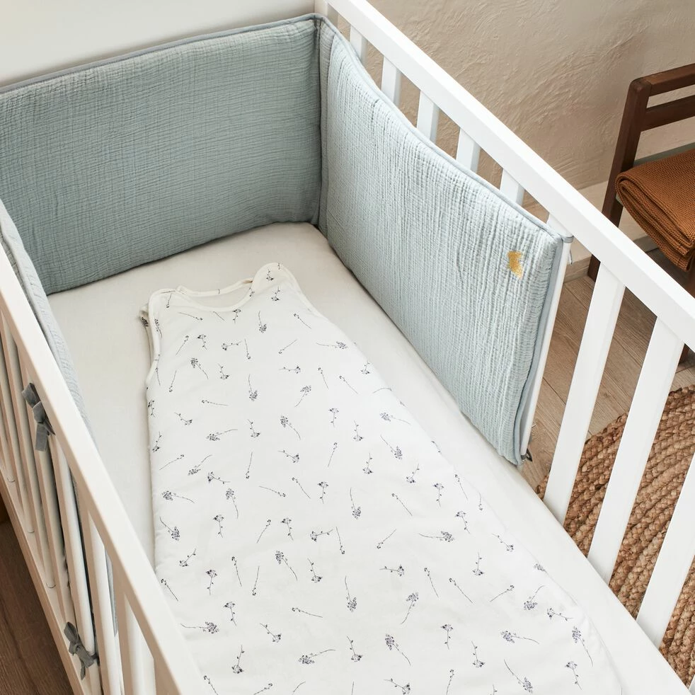 Optez pour ce joli tour de lit de couleur authentique et arborant une belle broderie en lurex. Mesurant 40cm de hauteur par 180cm de longueur, il est donc adapté pour un lit de 60×120 cm. Ce bel élément textile est fabriqué au Portugal avec du coton bio. Ce qui en fait un accessoire de qualité. Le tour de lit permet de protéger bébé lorsqu’il dort. En effet, votre enfant peut bouger pendant son sommeil, et ainsi se cogner la tête, coincer sa main ou son pied entre les barreaux du lit. Le tour de lit empêche ce genre d’incident. Pour venir compléter celui-ci et offrir à votre bambin des moments de repos paisibles, retrouvez aussi dans la même gamme, des gigoteuses et des langes que vous pouvez utiliser comme couverture.