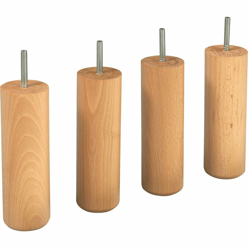 Un jeu de 4 pieds cylindriques en hêtre massif avec un joli vernis naturel et qui s’adaptent sur tous les sommiers tapissiers.