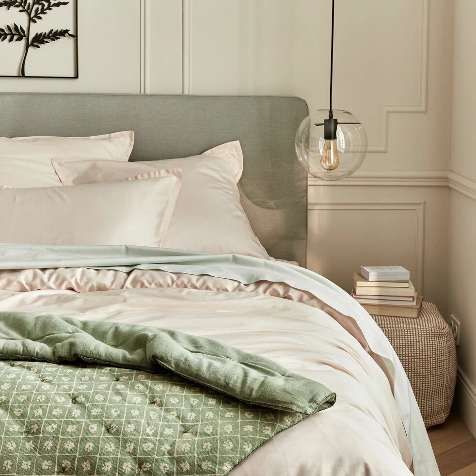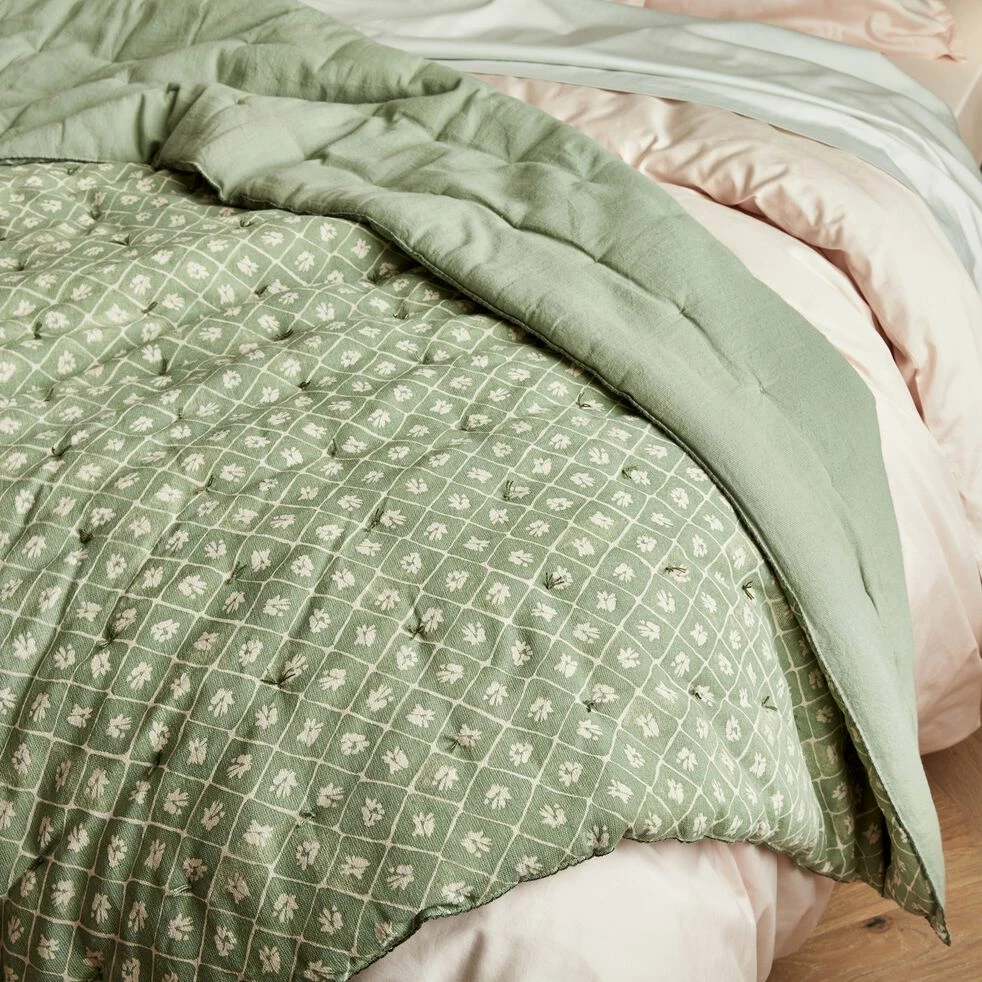 Esthétique et confortable, le couvre lit Piastre a toutes les raisons d’intégrer votre chambre à coucher. Nonchalamment posé sur le lit, il apporte de la joie de vivre à la pièce. Son motif floral met en scène de petites fleurs blanches sur un fond vert, spectacle printanier qui insuffle une fraîcheur bienvenue. Réversible, ce couvre lit en coton présente également une face unie pour adoucir la décoration. Ce couvre lit à motifs affiche des surpiqures ainsi qu’une couture en croquet, finition délicate et aérienne. De 220×240 cm, il apporte une belle épaisseur au lit et participe à un cocon où les rêvent nous happent.