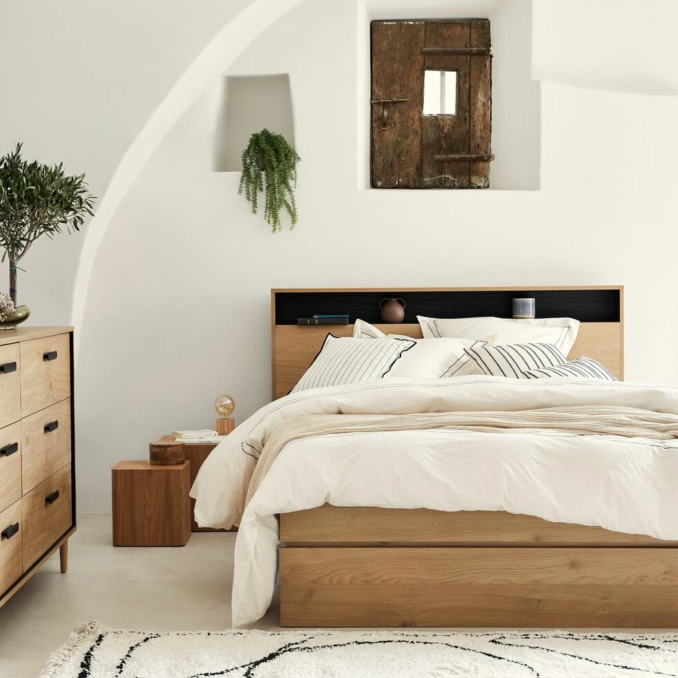 Découvrez le lit Salva: un cadre en bois avec une tête de lit, dans une couleur naturelle qui s’adaptera aisément à votre déco de chambre. Ses lignes épurées font que ce lit pourra facilement être disposé au milieu des meubles déjà existants. Pour une harmonie parfaite, vous pouvez choisir un ou plusieurs meubles de rangement dans la gamme Salva, dont les tiroirs de lit fournis à part. N’hésitez pas à égayer votre déco et à donner du cachet à votre lit en y associant un beau linge de lit. Ce lit est vendu sans sommier.
