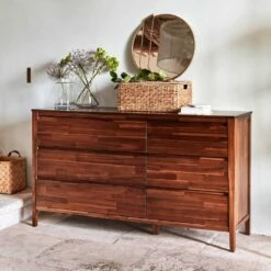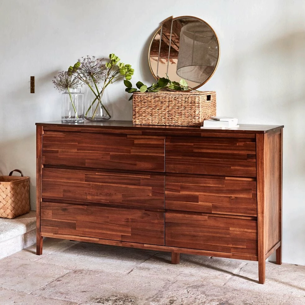La commode Thao est en acacia massif, un bois résistant et aux teintes chaleureuses qui apporte de l’exotisme à la chambre. Constituée de deux côtés à trois tiroirs, cette commode offre une grande capacité de rangement. C’est un meuble à la fois très pratique et décoratif. Sa couleur naturelle en fait un meuble intemporel, dont on ne se lasse, et très élégant.