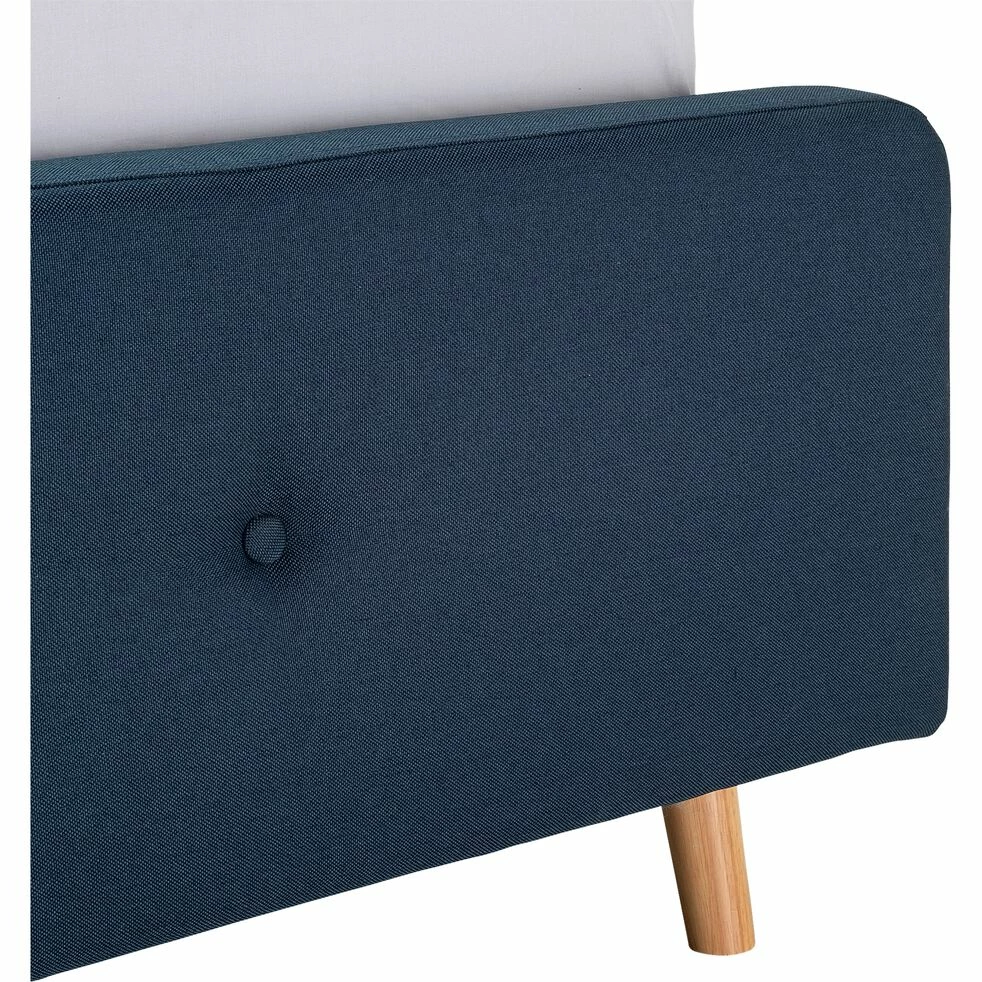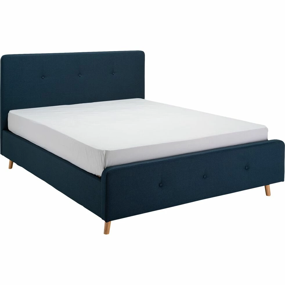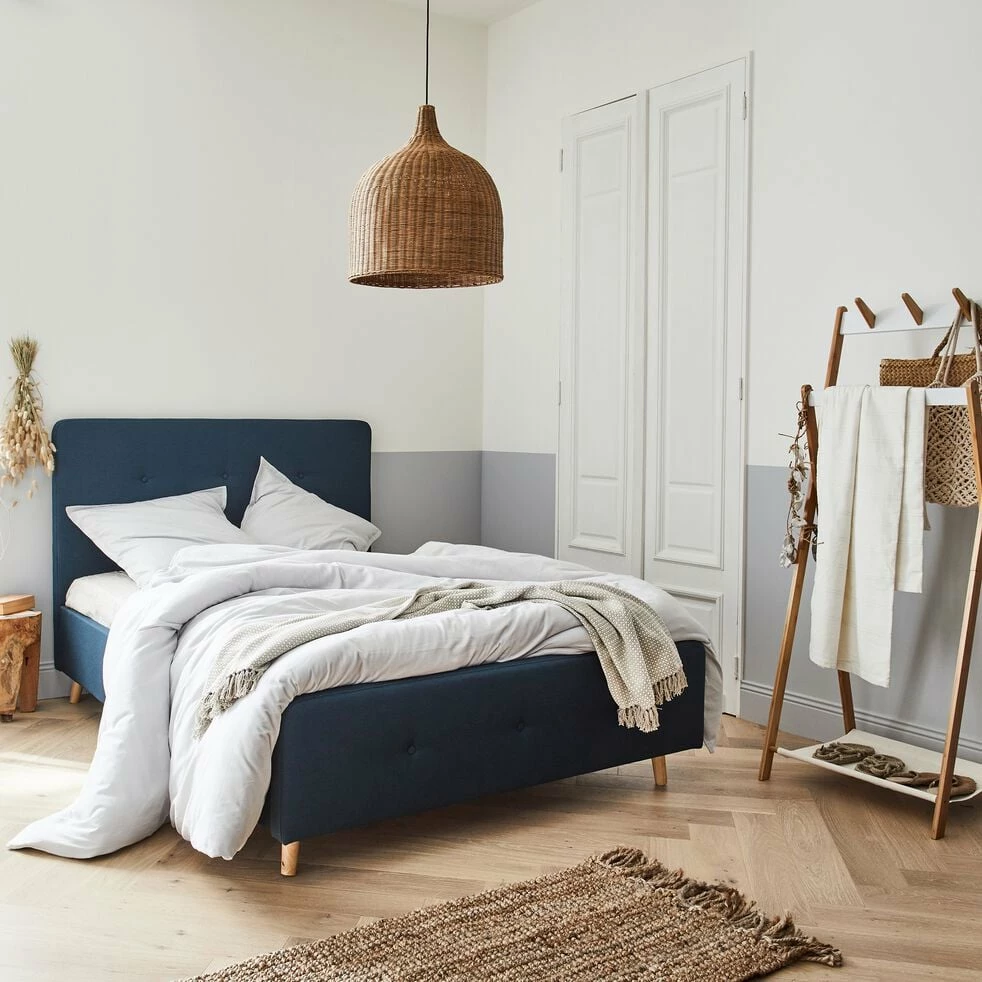 Ce lit deux places, ici en 160×200 cm, trouve aisément sa place dans tous les intérieurs grâce à son design épuré et à son revêtement capitonné en tissu bleu figuerolles. Il ajoute une note colorée d’un bleu intense pour donner un air chaleureux à votre chambre à coucher. Une pièce dédiée à la détente et au repos dans laquelle le lit joue un rôle essentiel. Associez-y une jolie parure de lit en accord avec votre décoration d’intérieur et le reste de votre mobilier. Une fois installés dans ce lit, profitez d’un agréable moment de détente.